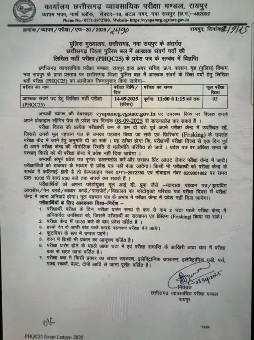 छत्तीसगढ़ व्यवसायिक परीक्षा मंडल (व्यापम) रायपुर ने जिला पुलिस बल में आरक्षक संवर्ग भर्ती (PHQC25) की लिखित परीक्षा के लिए प्रवेश पत्र जारी कर दिए हैं। परीक्षा 14 सितंबर 2025 (रविवार) को होगी।
