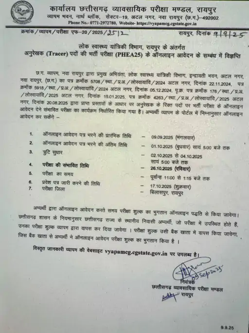 रायपुर। छत्तीसगढ़ व्यवसायिक परीक्षा मंडल (व्यापम) ने लोक स्वास्थ्य यांत्रिकी विभाग (Public Health Engineering Department – PHE) में अनुरेखक (ट्रेसर) के 37 पदों पर भर्ती के लिए नोटिफिकेशन जारी कर दिया है। इच्छुक उम्मीदवार 1 अक्टूबर 2025 शाम 5:00 बजे तक ऑनलाइन आवेदन कर सकते हैं।