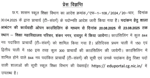 छत्तीसगढ़ शासन के स्कूल शिक्षा विभाग द्वारा प्राचार्य (टी-संवर्ग) के पदोन्नति आदेश 14 अगस्त को जारी कर दिए गए थे। अब इन प्राचार्यों की पोस्टिंग के लिए ओपन काउंसलिंग की प्रक्रिया सोमवार सुबह 10 बजे से शंकर नगर स्थित शासकीय शिक्षा महाविद्यालय परिसर में शुरू हो चुकी है।