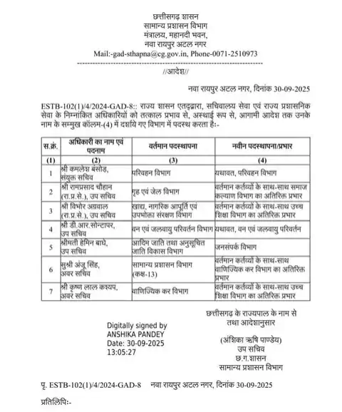 सात राज्य प्रशासनिक सेवा अधिकारियों को भी नई जिम्मेदारी दी गई है। इनमें— रामप्रसाद चौहान को समाज कल्याण विभाग का अतिरिक्त प्रभार ,हेमिन बाघे को जनसंपर्क विभाग में पदस्थ किया गया |अन्य 5 अधिकारियों को भी अलग-अलग विभागों और जिलों में नई जिम्मेदारी सौंपी गई है।