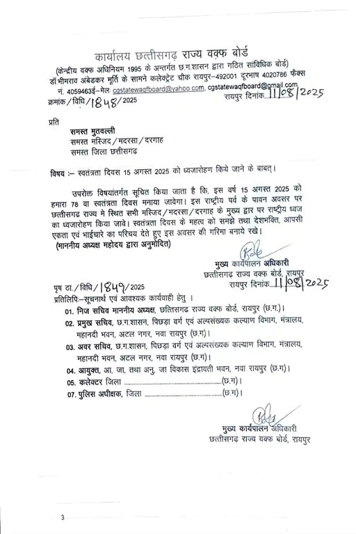 Chhattisgarh Masjid Flag Hoisting -छत्तीसगढ़ में पहली बार मस्जिदों में ध्वजारोहण: स्वतंत्रता दिवस पर राज्य वक्फ बोर्ड का निर्देश, तिरंगे की गरिमा बनाए रखने की अपील