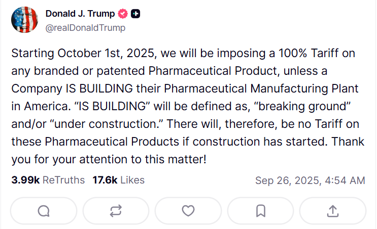 “हम 1 अक्टूबर 2025 से किसी भी ब्रांडेड या पेटेंटेड फार्मास्यूटिकल प्रोडक्ट पर 100% टैरिफ लगाएंगे, जब तक कि संबंधित कंपनी अमेरिका में अपना मैन्यूफैक्चरिंग प्लांट नहीं बना लेती। जिन कंपनियों ने प्लांट का काम शुरू कर दिया है, उन पर यह शुल्क लागू नहीं होगा।”