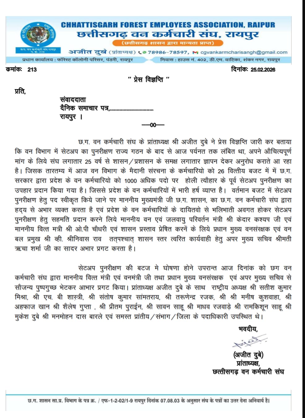 छत्तीसगढ़ वन कर्मचारी संघ के प्रांताध्यक्ष अजीत दुबे ने 25 फरवरी 2026 को जारी प्रेस विज्ञप्ति में बताया कि राज्य गठन के बाद से वन विभाग के सेटअप पुनरीक्षण की मांग लगातार लंबित थी। इस संबंध में संघ पिछले 25 वर्षों से शासन और प्रशासन को ज्ञापन सौंपकर मांग कर रहा था।