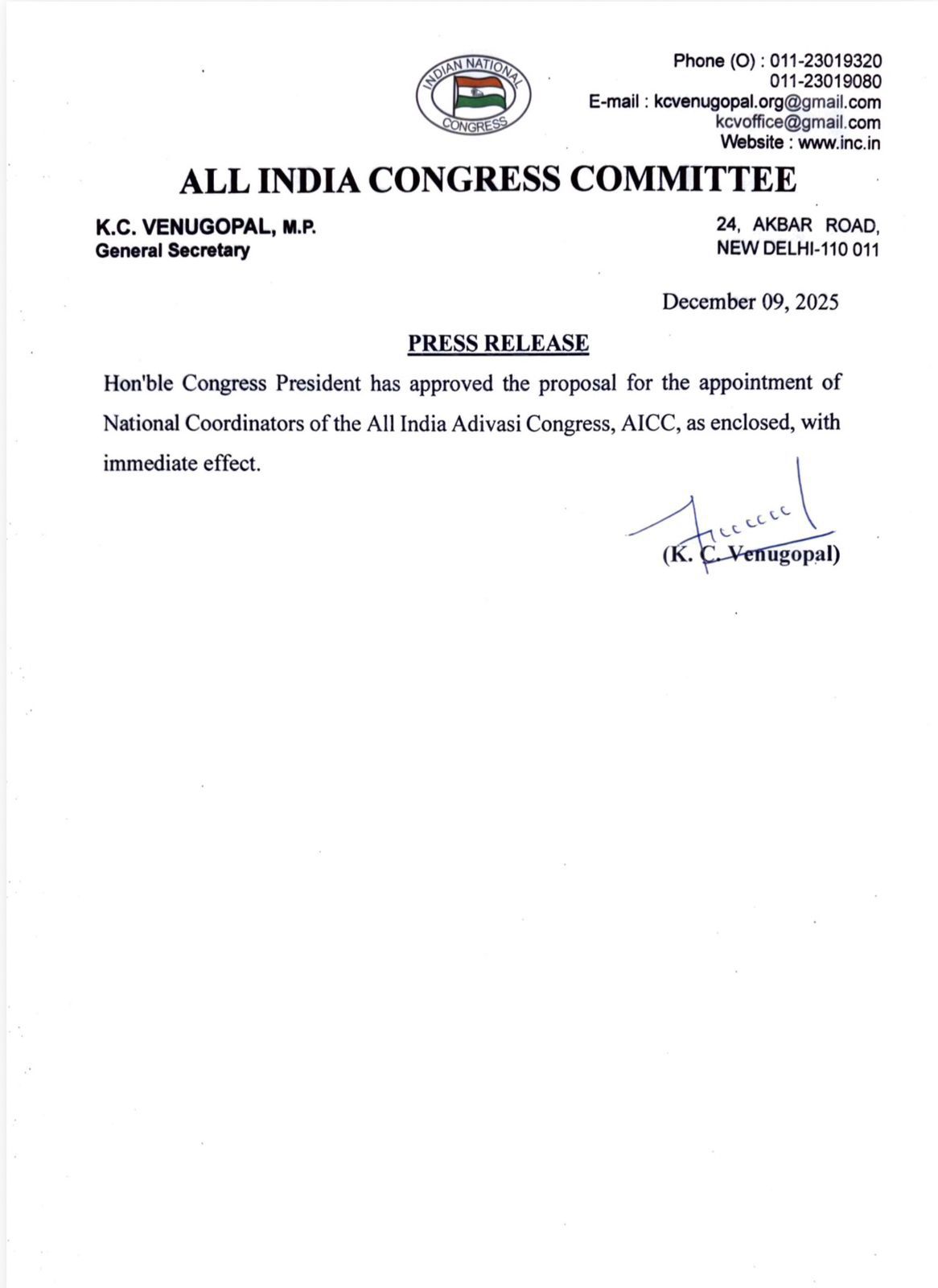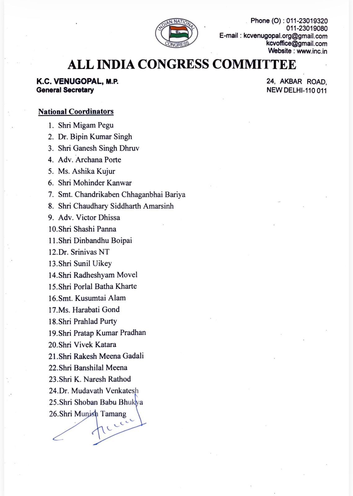 List Of National Coordinators -कांग्रेस हाईकमान ने ऑल इंडिया आदिवासी कांग्रेस के नए कोऑर्डिनेटर्स की सूची जारी की है। कुल 26 नामों में से छत्तीसगढ़ की दो महिला आदिवासी नेताओं को राष्ट्रीय स्तर पर अहम भूमिका दी गई है। जशपुर की अशिका कुजूर और मरवाही की अर्चना पोर्ते को राष्ट्रीय कोऑर्डिनेटर बनाया गया है।