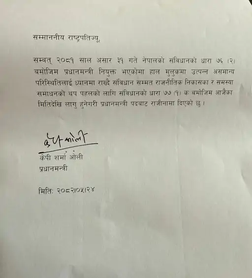 ओली ने राष्ट्रपति को दिए अपने त्यागपत्र में लिखा –