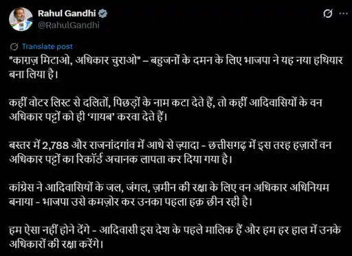 राहुल गांधी ने आरोप लगाया कि भाजपा सरकार बहुजनों और आदिवासियों के अधिकार छीनने की नई साजिश कर रही है। उन्होंने कहा – “काग़ज़ मिटाओ, अधिकार चुराओ’’ यही भाजपा का नया हथियार बन गया है। कहीं वोटर लिस्ट से दलितों और पिछड़ों के नाम काट दिए जाते हैं, तो कहीं आदिवासियों के वन अधिकार पट्टे ही ‘गायब’ कर दिए जाते हैं।