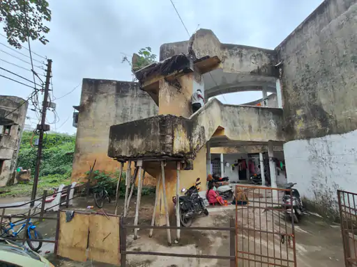 पहली मंजिल तक जाने वाली सीढ़ियां बल्लियों के सहारे खड़ी हैं।