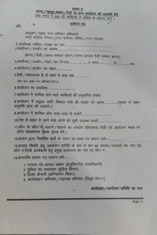 किसी भी आयोजन की अनुमति के लिए आवेदक को न्यूनतम 7 दिन पहले निर्धारित प्रारूप में आवेदन करना होगा। आवेदन के साथ चार विभागों के अनापत्ति प्रमाणपत्र (NOC) संलग्न करना भी जरूरी होगा।