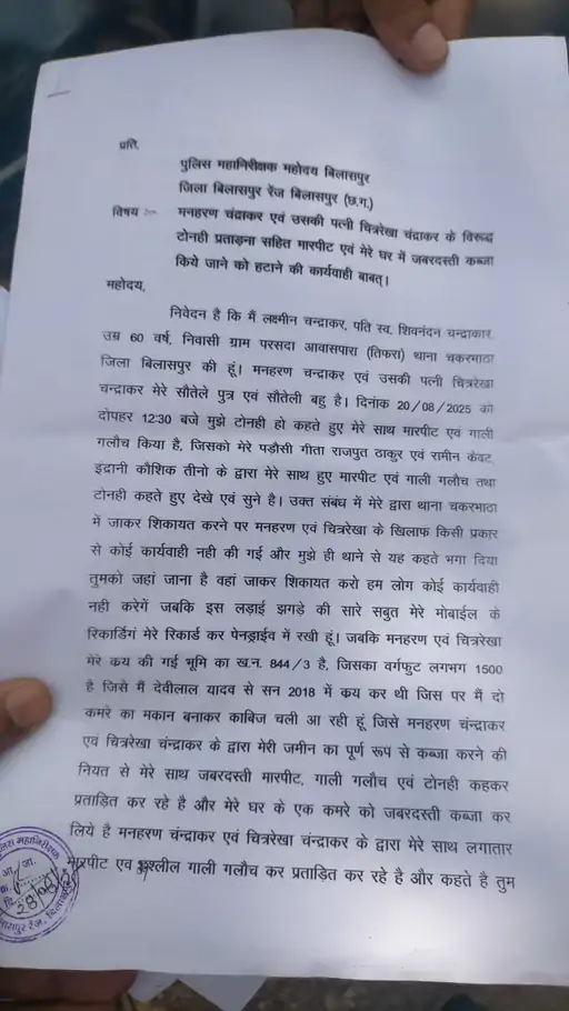 Son And Daughter In Law Attacked Their Mother -बिलासपुर : चकरभाठा थाना क्षेत्र में एक 60 वर्षीय बुजुर्ग महिला को उसके ही सौतेले बेटे और बहू ने टोनही कहकर मारपीट की और मकान-जमीन से बेदखल करने का दबाव बनाया। पीड़िता ने जब पुलिस से शिकायत की तो कार्रवाई करने की बजाय उसे थाने से भगा दिया गया।